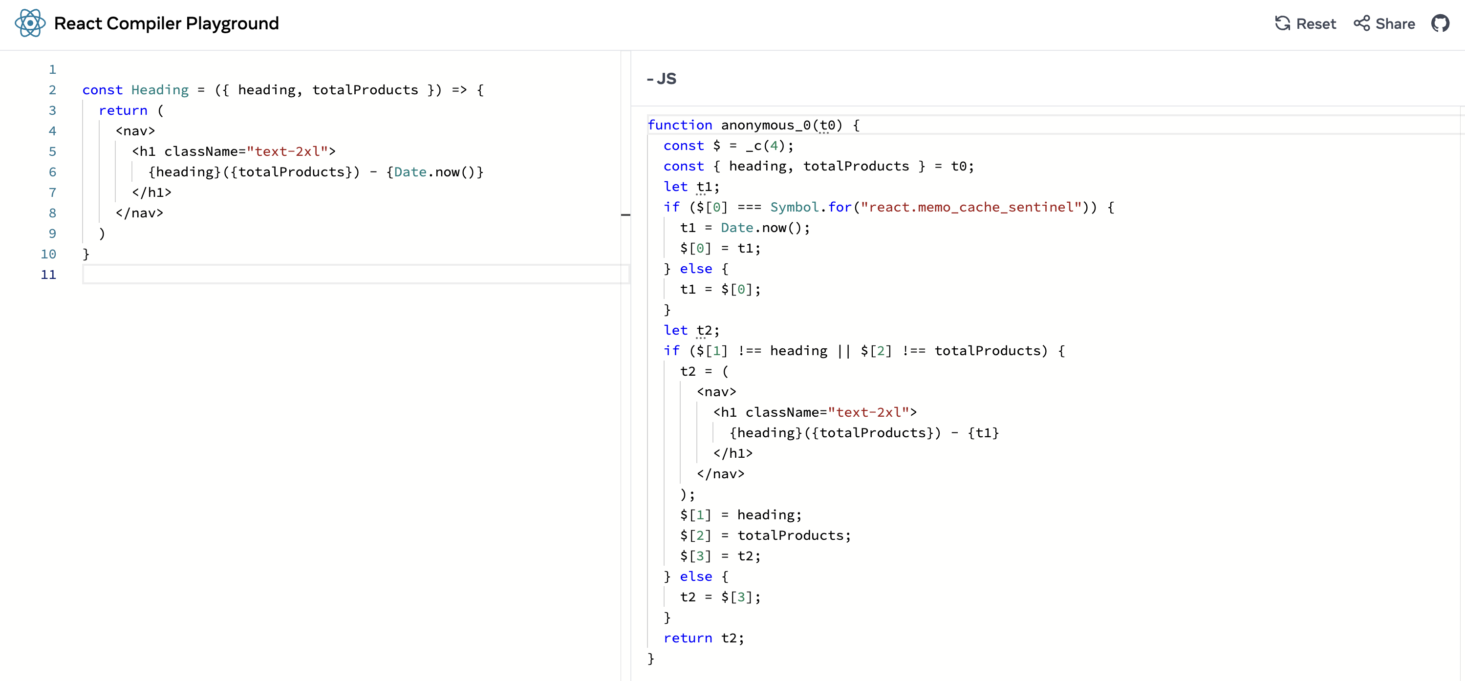 You can now paste any other component source code into the left side and look into the generated JavaScript code to help you understand what's going on as we did above. This will help you to get a better grip on how the compiler performs the memoization techniques in the compilation process.